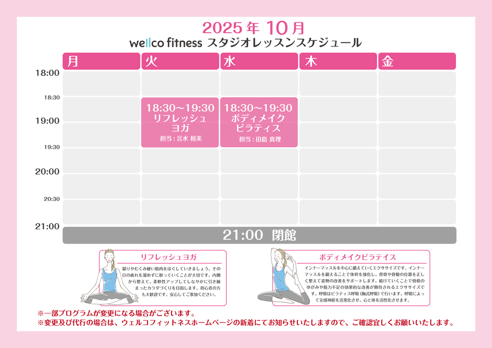 2025年10月 レッスンスケジュール 投稿日:2025年10月3日2025年10月3日 投稿者: master20220406 カテゴリー: お知らせ 2025年10月のレッスンスケジュールは、下記のとおりです。 ↓画像をクリックするとPDFがみられます↓