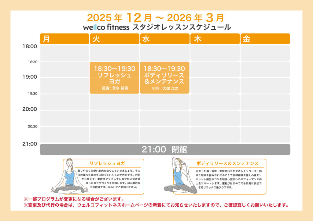 2025年12月〜2026年3月 レッスンスケジュール 投稿日:2025年10月31日2025年10月31日 投稿者: master20220406 カテゴリー: お知らせ 2025年12月〜2026年3月のレッスンスケジュールは、下記のとおりです。↓画像をクリックするとPDFがみられます↓