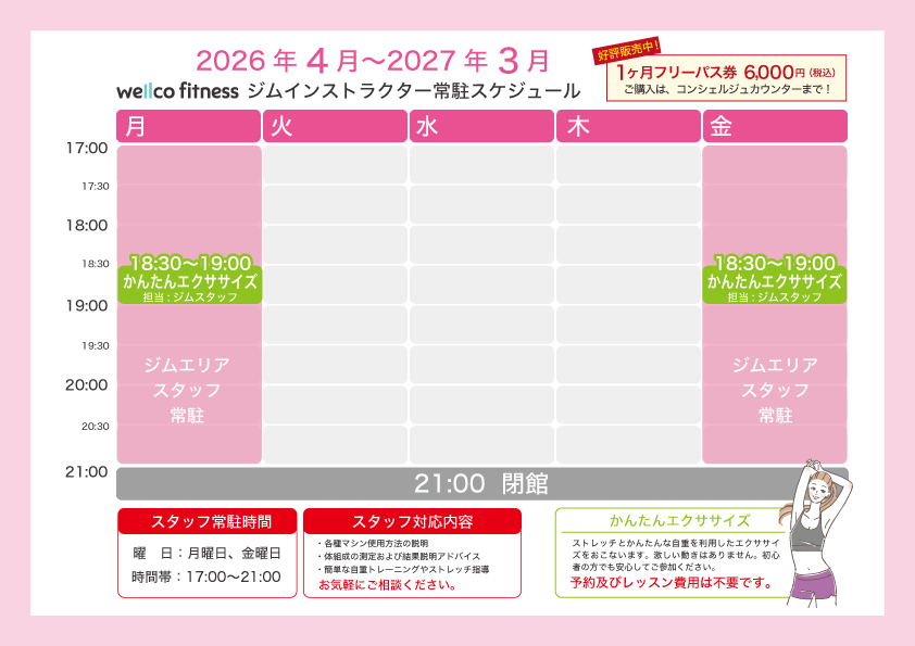 2026年4月〜2027年3月ジムインストラクター常駐スケジュール 投稿日:2026年4月16日2026年4月16日 投稿者: master20220406 カテゴリー: お知らせ 2026年4月〜2027年3月のジムインストラクター常駐スケジュールは、下記のとおりです。↓画像をクリックするとPDFがみられます↓